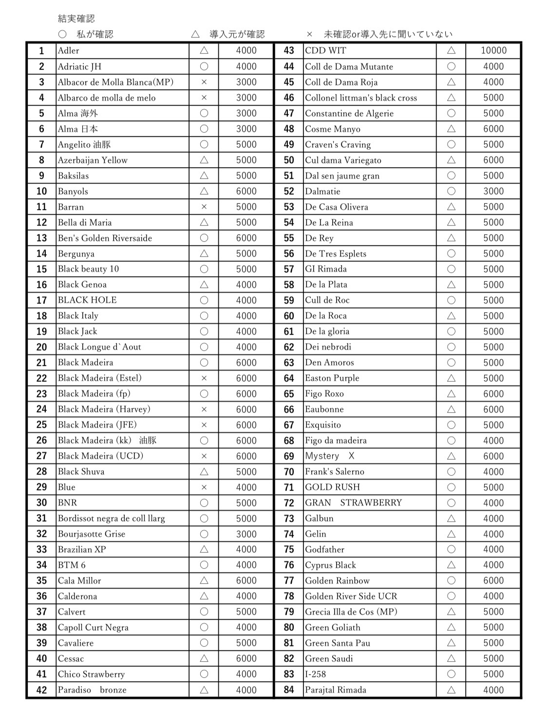 導入先を聞きたい方は予約注文の際にお答えします。もちろん導入先が気に入らない場合はその品種のキャンセルも大丈夫です。一応まともな導入先の品種をピックアップしてます。他にもたくさん品種がありますが、この一覧以外は挿し木予定がないので早くしないと剪定し穂木自体破棄されます。一覧以外は早めにご相談ください。