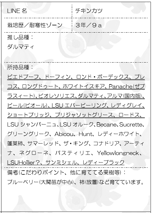 項目はLINE名、栽培歴、耐寒性ゾーン、推し品種、所持品種、備考(他の果樹など)です。